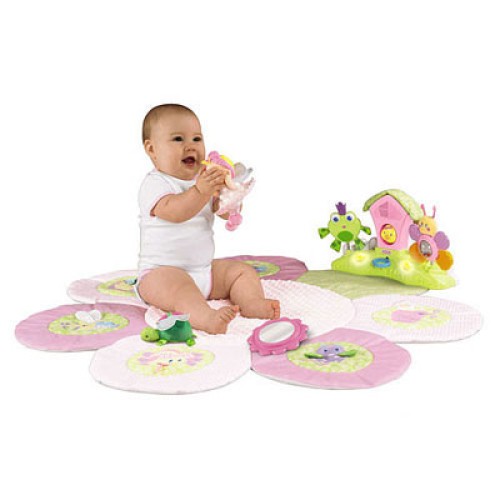 На дугах висят игрушки, которые могут служить погремушками и прорезователями, висит розовое зеркальце, в котором будет любоваться собой Ваша малышка. Мягкая подушечка, чтобы малышке было удобно, когда она лежит на животике. На коврике расположена музыкальная панелька со сказочным домиком, лягушкой и бабочкой.